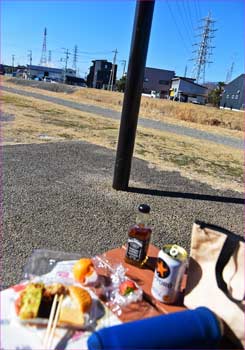 地図もなくただ送電鉄塔を眺めながら辿るだけ、紆余曲折は毎度の行程。ゴルフ場に遮られたり雑木山に入り込んだり、上がったり下がったり遠回りしながら茅ヶ崎線送電鉄塔巡りでした。途中から富士が見えたり大山が望めたときは足も軽くなりましてそのまま相模線ぶつかったところが昨年の茅ヶ崎線№21鉄塔と。もう昼を過ぎてましたので茅ヶ崎変電所を見てその先の小川傍の河童徳利広場で小宴昼餉でした。通りから少し離れて人影もなく紅白鉄塔や富士を見ながら一杯でした。途中のコンビニで購入した弁当で昼をと。