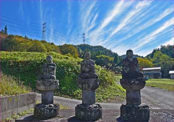 | (参道の地蔵群、背後に白雲が) | (宗本寺の裏山に送電線が連なって) |