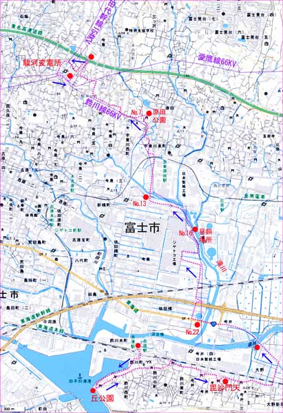 ※送電鉄塔……鈴川線66KV 22,20,19,18,17-1,17,16,15,14,13,12,11,10,9,8,7,2,1。今泉線№1。愛鷹線1,2,3,6,7。 中里線1。吉原線1。田代幹線154KV 201-29-1,201-30,201-31。